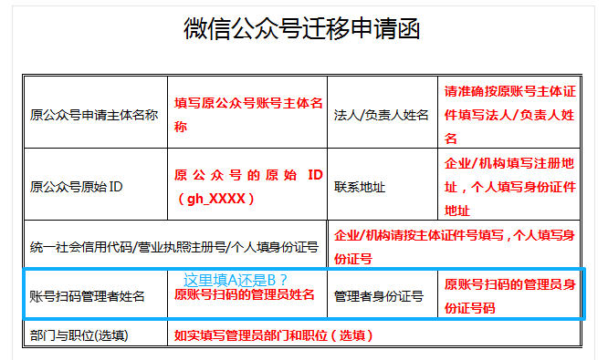 现在填写迁移申请函有个疑问,“账号扫码管理者姓名”应该填A还是B?