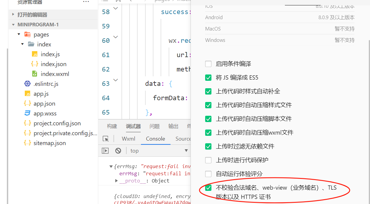 由于没有公网跟域名,本地开发的时候够选了不效验合法域名了,getUserProfile中使用wx.request时报错,为什么?需要怎么设置