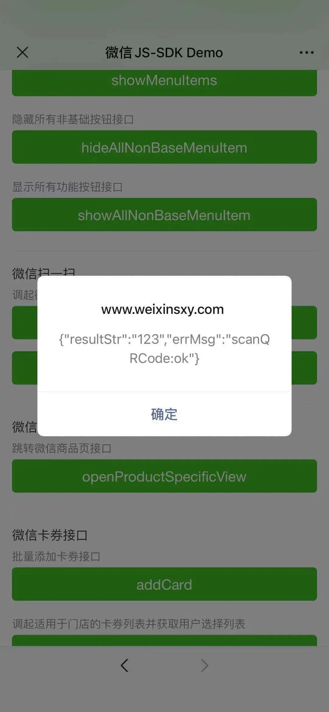 测试微信扫一扫 直接返回结果 ,用摄像头摆好对准之后再按按钮,会弹框显示这个,我对准的二维码内容就是123