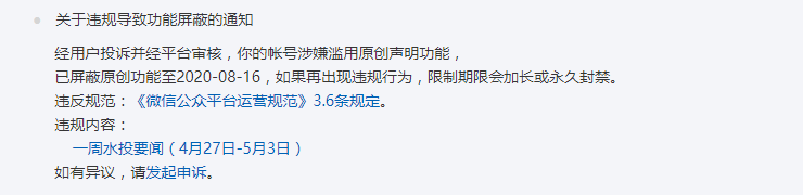 被处罚屏蔽原创声明功能的通知截图及被处罚的文章链接: