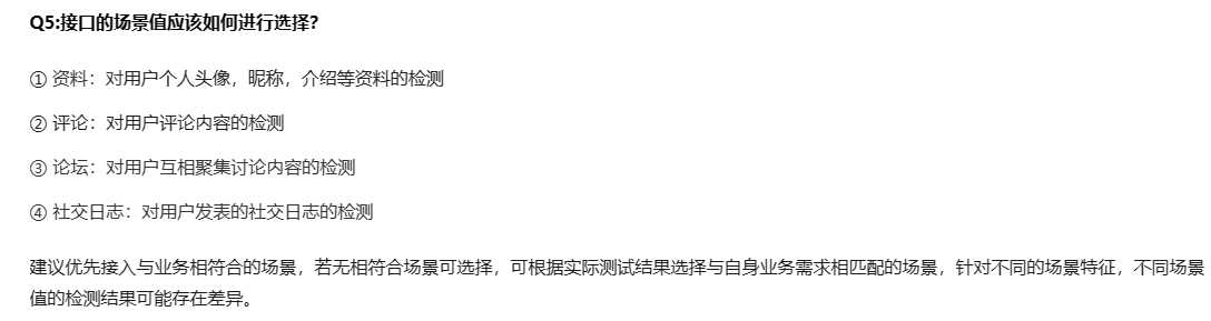 你好,建议优先接入与业务相符合的场景,若无相符合场景可选择,可根据实际测试结果选择与自身业务需求相匹配的场景,针对不同的场景特征,不同场景值的检测结果可能存在差异。