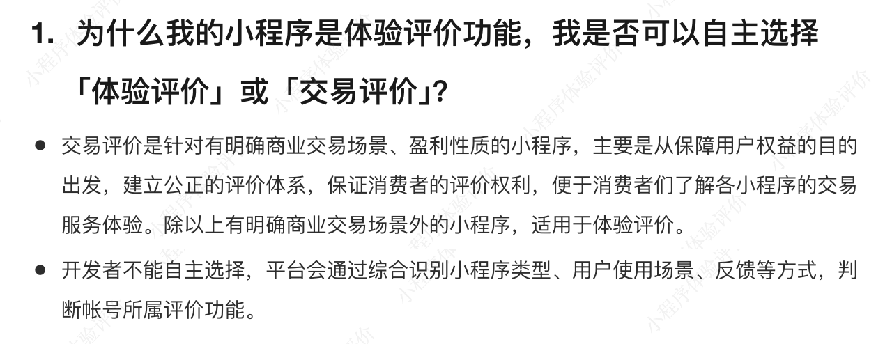 但目前咱们平台给我们的小程序定义的是【体验评价】,想请教下,我们是否符合【交易评价】小程序的类型?是否可以帮我们切换成【交易评价】?这样我们可以在用户买入、卖出金融产品后,根据咱们平台规则,唤起【交易评价】,方便用户更好的对我们的交易服务进行有效评价