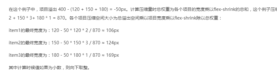 计算结果= 宽度 - 总溢出空间 * 项目宽度 * flex-shrink / 总权重;