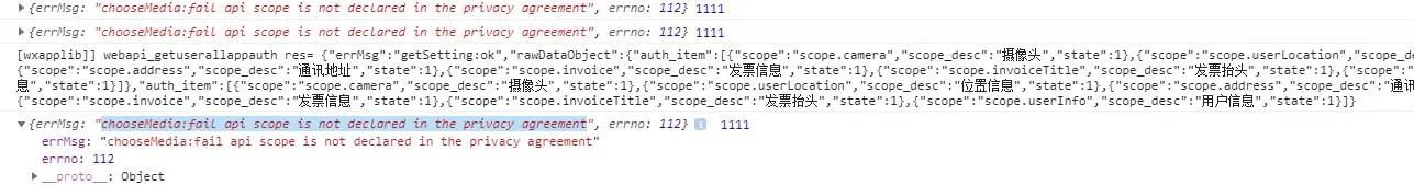 { "errMsg": "A:fail api scope is not declared in the privacy agreement", "errno": 112 }
