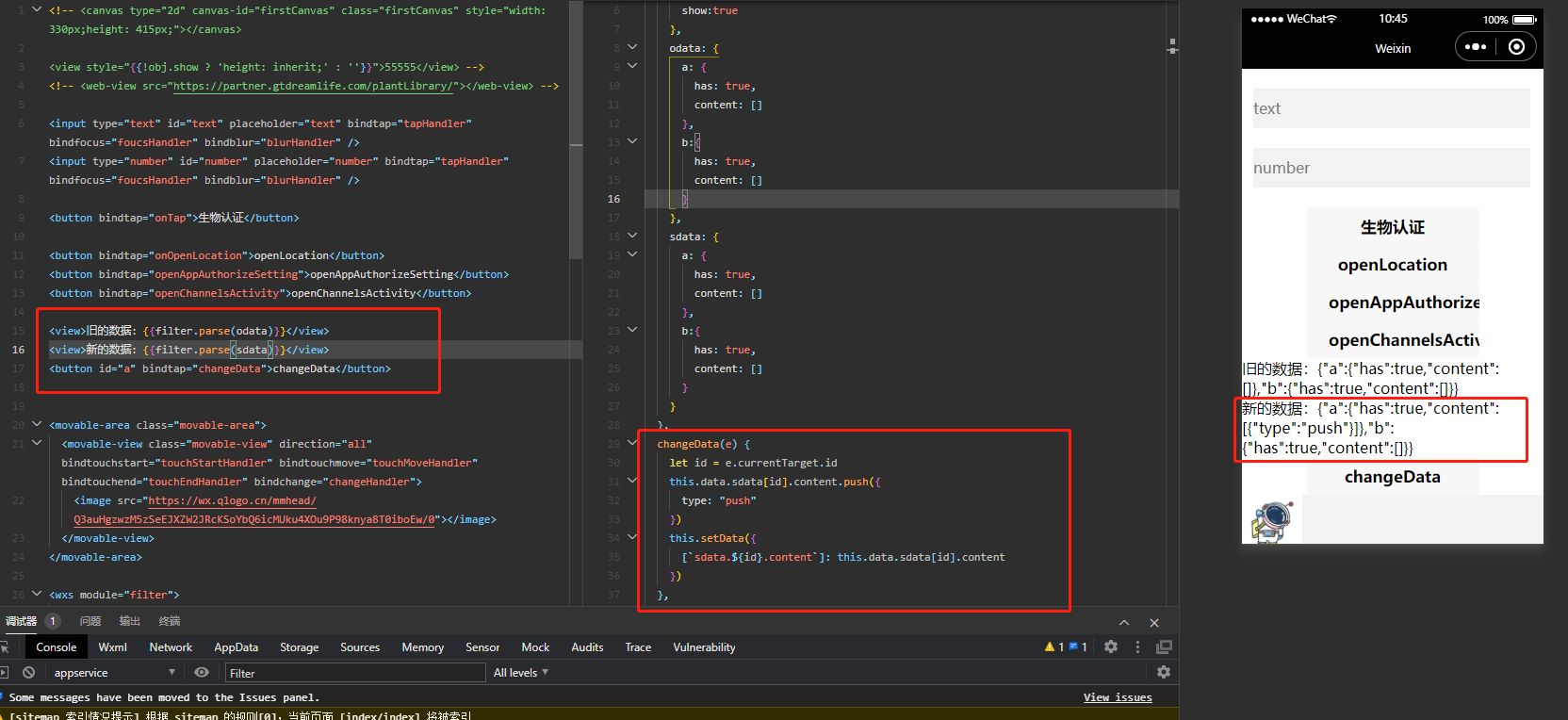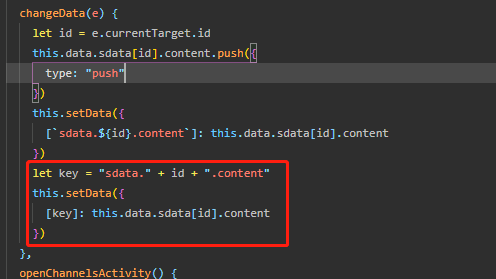 let content=that.data.sdata.a.content content.push(1) that.setData({ "sdata['a'].content": content })that.setData({"sdata['"+index+"'].content": content})"'sdata['+index+'].content'":chang 这种你实际跑下会发现报错Only digits (0-9) can be put inside [] in the path string 'sdata['+index+'].content':change单独拼编译都过不去至于用个变量等于'sdata['+index+'].content',编译是可以通过,但是无效果this.setData({ sdata: JSON.parse(JSON.stringify(this.sdata)), })