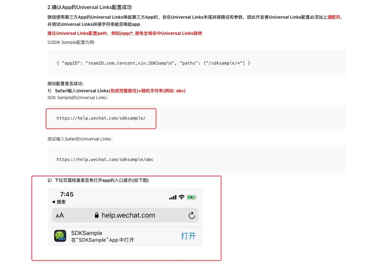 微信 open sdk iOS 端接入的时候,其中给出的 sdksample demo 版本太老了,不适用其中的指引。其次demo 的 Universal Links:https://help.wechat.com/sdksample/ 并不能正确在手机上打开(没有下面的 SDKSample 入口)。请问一下你们有出现这种情况吗?