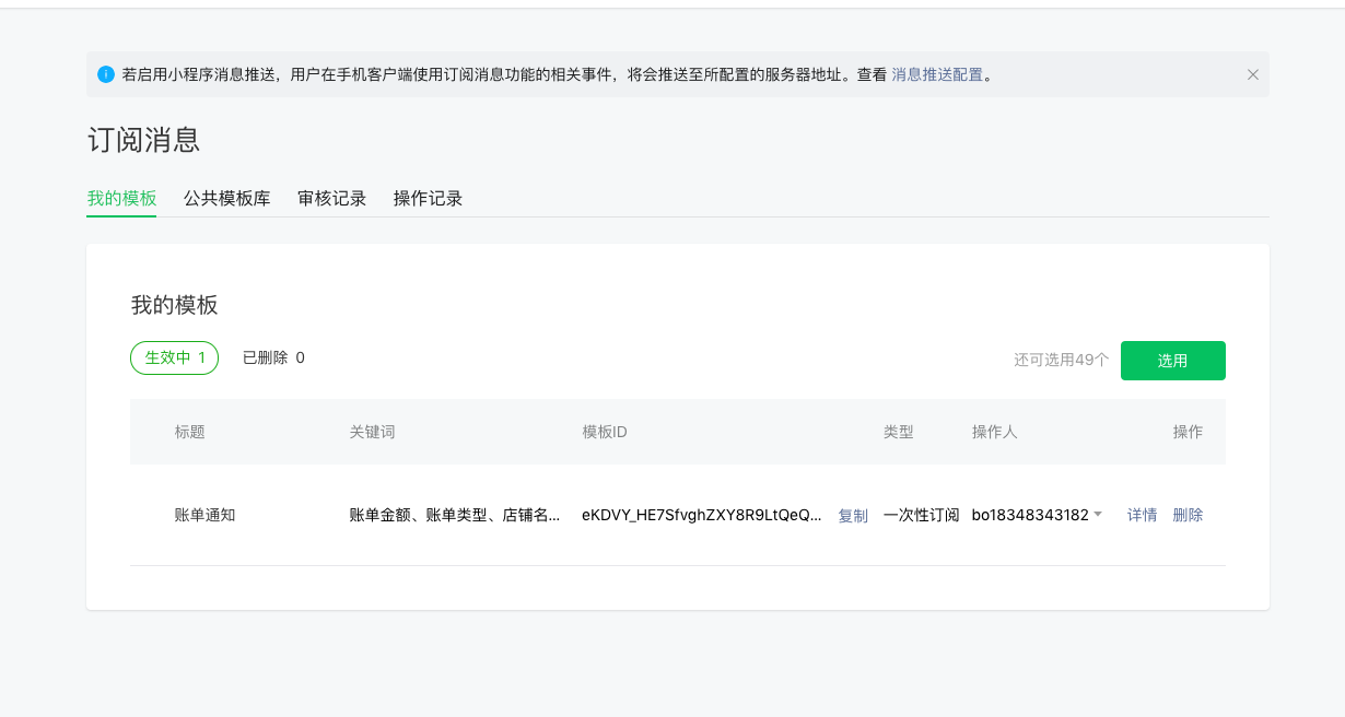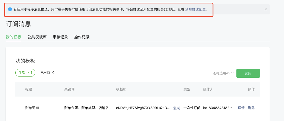 提示: 若启用小程序消息推送,用户在手机客户端使用订阅消息功能的相关事件,将会推送至所配置的服务器地址。查看 消息推送配置。