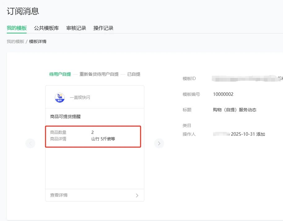 如图:「订阅消息」模块,《购物(自提)服务动态》模板中,没有提示商品详情和商品数量的字段名是什么