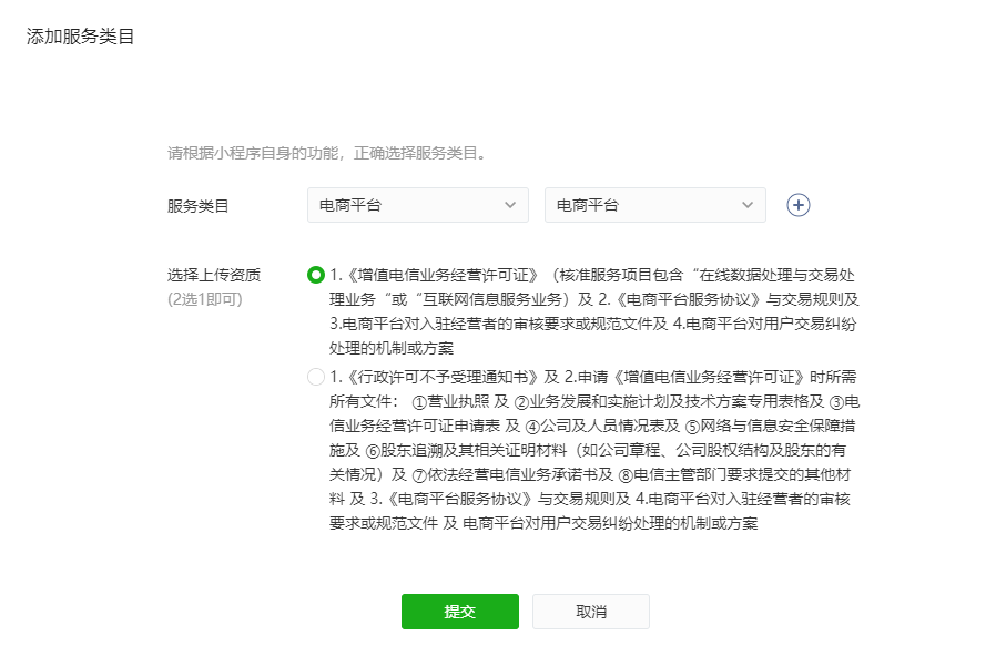 2)涉小程序类目资质主体需与小程序注册主体一致;若小程序非电商性质,提供在线销售初级农产品,建议以资质主体申请小程序,并申请对应的服务类目