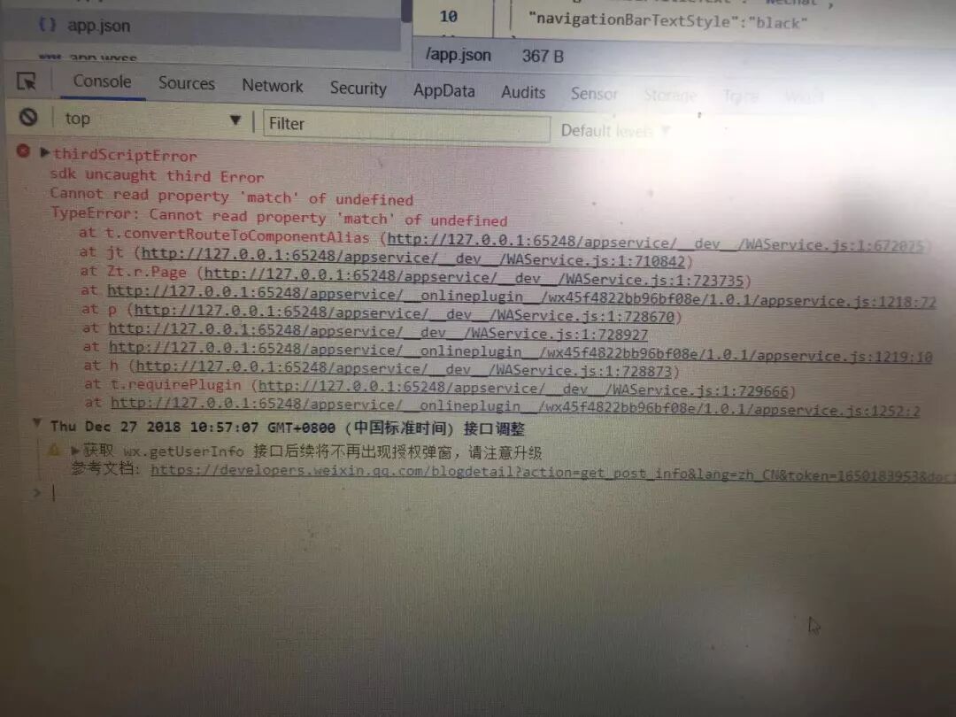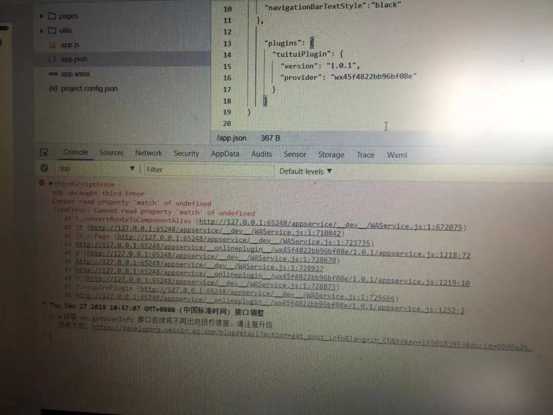 微信小程序在引入插件之后不允许对App、Page进行修改,将微信小程序基础版本升级至2.6.3以上即可解决。