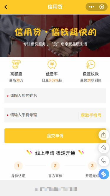 用户线上选择金融产品点击提交,主要就是留下姓名跟电话。 然后由我公司线下帮助用户与银行直接达成合作。线上不产生任何支付跟在线放贷的功能