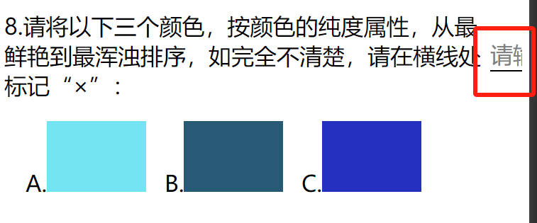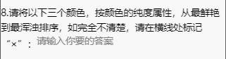 <text >8.请将以下三个颜色,按颜色的纯度属性,从最鲜艳到最浑浊排序,如完全不清楚,请在横线处标记“×”:</text>