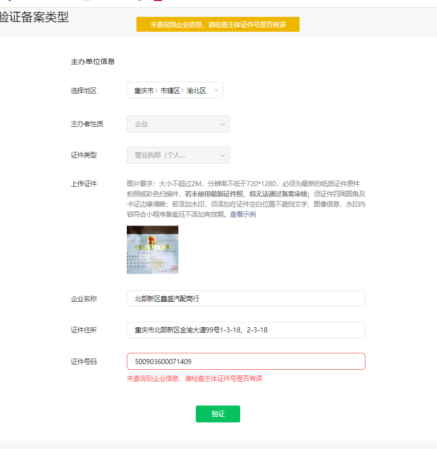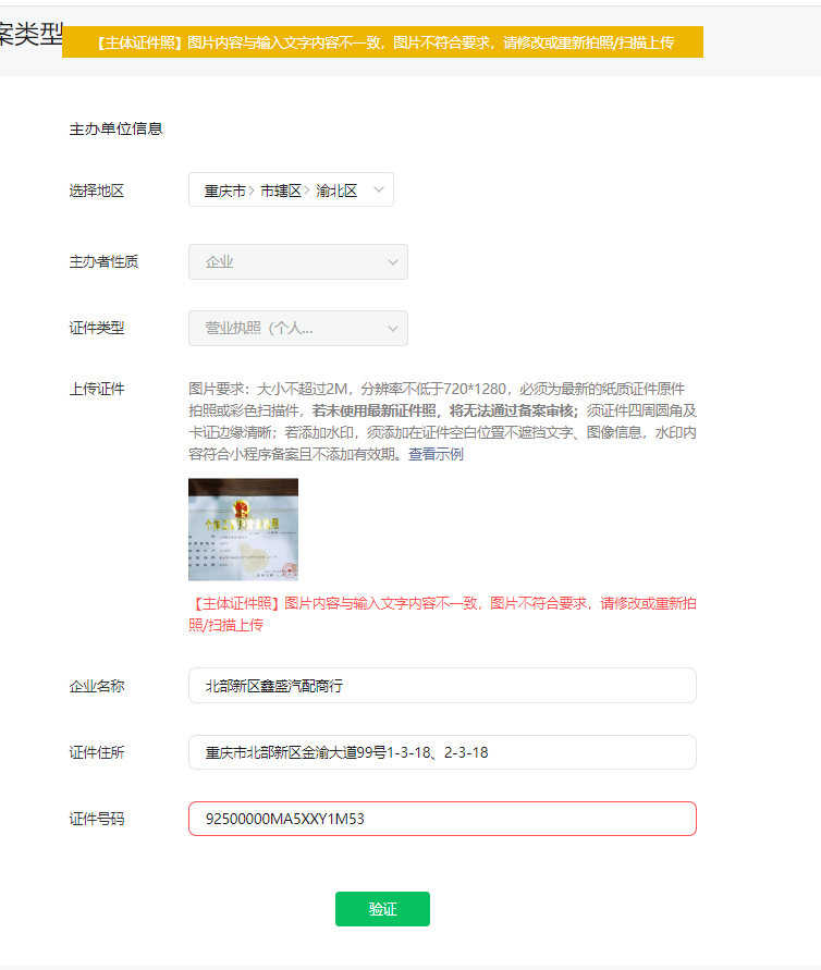 营业执照上是注册号,备案时证件号码输入注册号提示未查询到企业信息,输入统一社会信用代码又提示 图片内容与输入文字内容不一致,这怎么办???