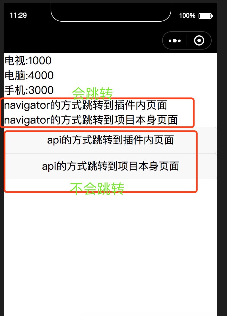 在插件中,仅当当前页面是插件页面的时候能够调用 wx.navigateTo 。如果不是插件页面的话,请使用 navigator 组件。
