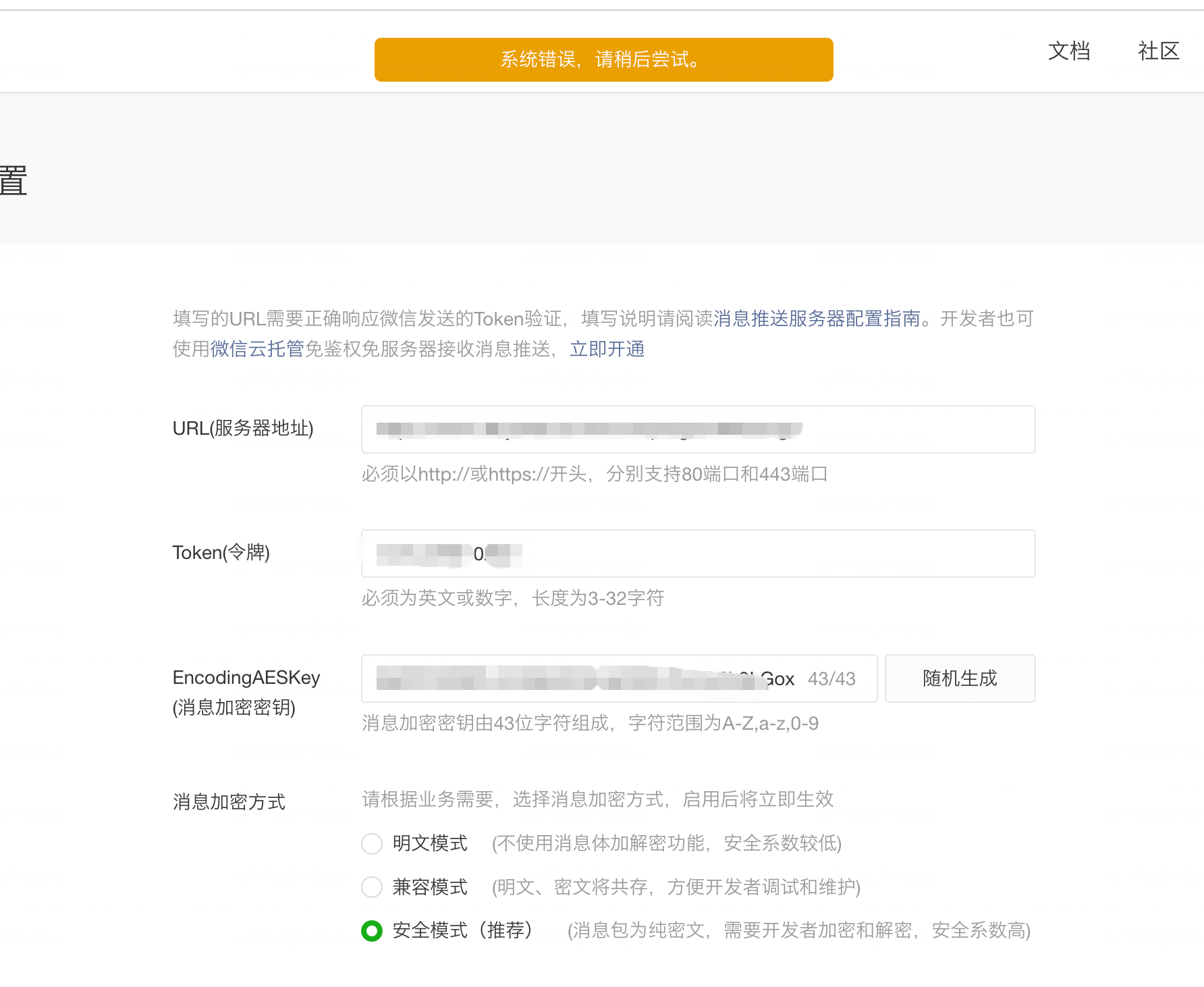 请看图,就是在配置消息推送配置时,填入内容了,点击确定后报错"系统错误"
