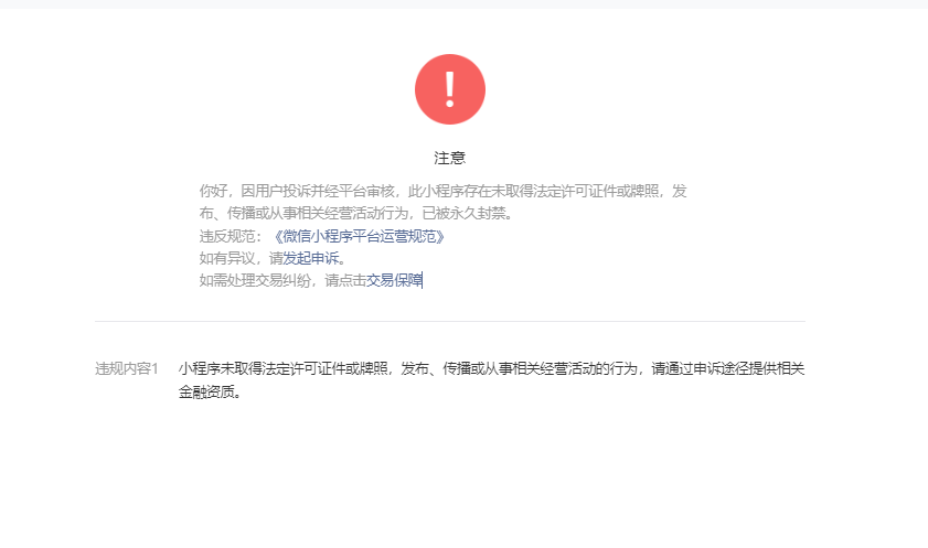 你好,因用户投诉并经平台审核,此小程序存在未取得法定许可证件或牌照,发布、传播或从事相关经营活动行为,已被永久封禁。