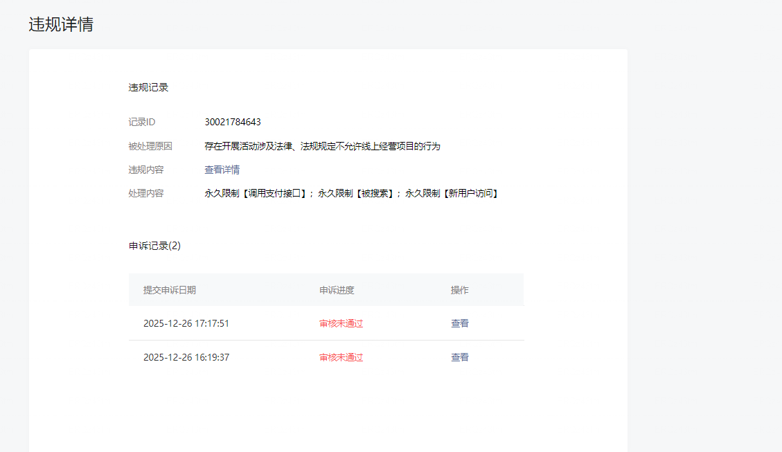 为了不影响生产,我们直接先下线代缴车费功能,审核通过了,但是去申诉一直截图告诉我们代缴车费违规,我们都下线了,这是干什么?