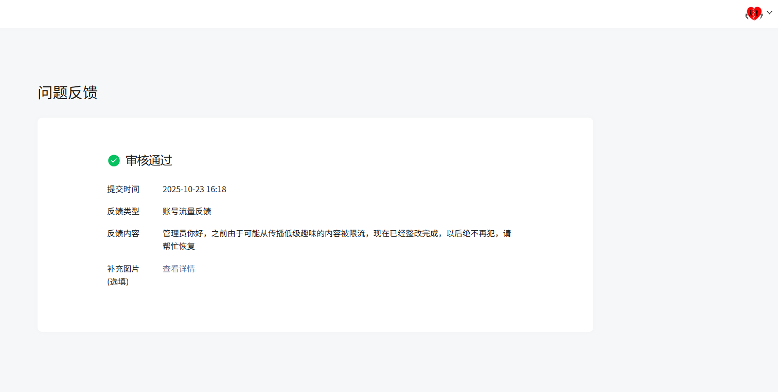 我提交后大概半个小时审批通过,系统发来提示通过,下次发文流量恢复正常(未实测,今天发文试一下):
