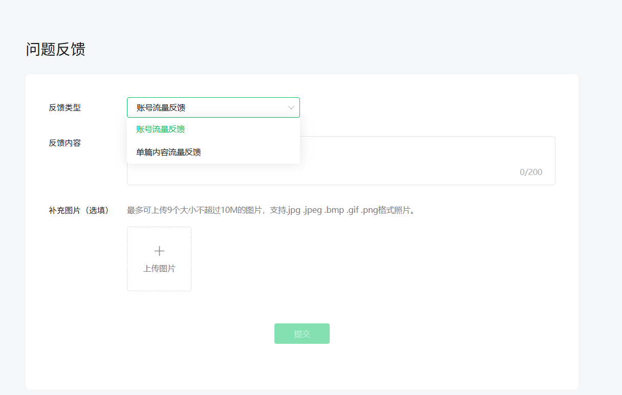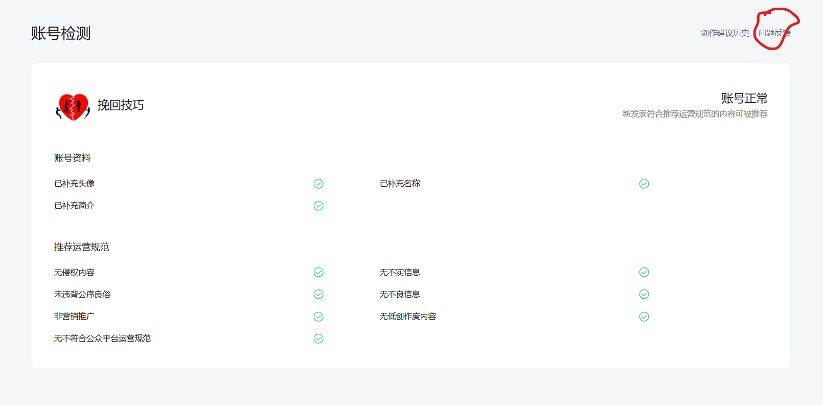 于是,我把那几篇违规的文章删除后立马截图点了下图右上角的“问题反馈”(如下图)