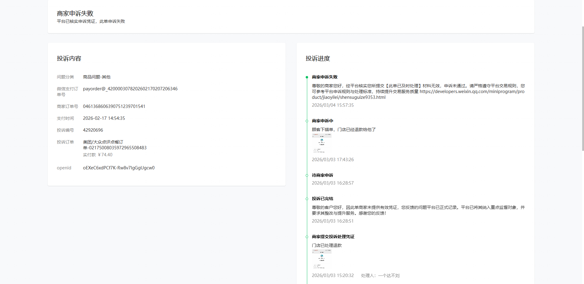 因超过系统原路退回时间,门店微信转给顾客的钱,已经退款成功且顾客收到了钱,平台还是判定没有提供有效证据