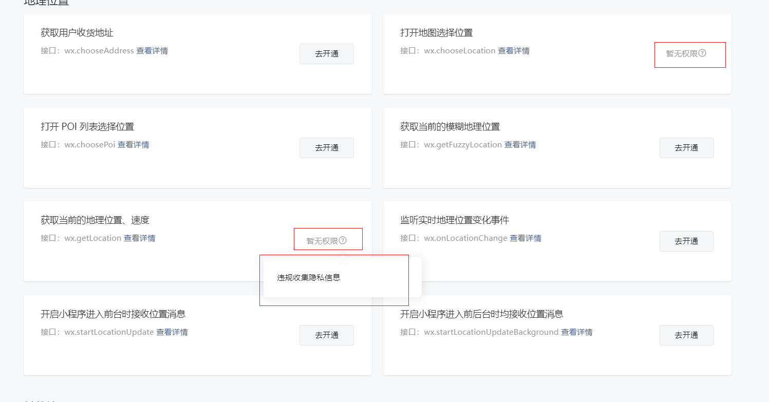 3.现在要对定位进行整改,开发者调用wx.getLocation,一直走失败的回调并且报{errMsg: "getLocation:fail no permission"}