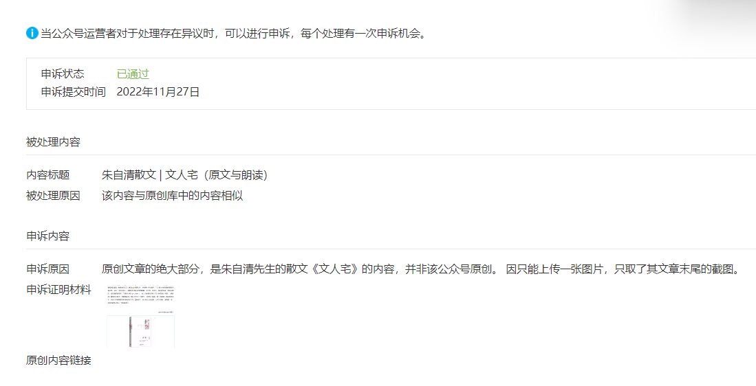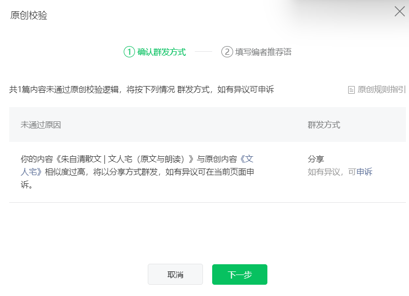 个人推测,是因为:该公众号的文章还在原创库中,但由于其文章主要是引用朱自清先生的《文人宅》,所以导致发表时(程序与该文对比),又得出同样的结论。还是没有办法发表。