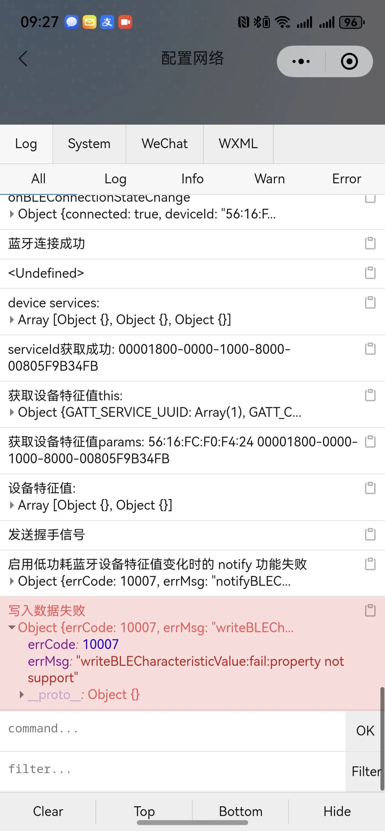 Object {errCode: 10007, errMsg: "writeBLECh...