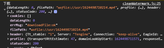 console.log('下载', res)这里的数据打印出来是什么, wx.downloadFile这个API里面加个header:{'content-type': 'video/mp4’}试试,我之前用这个API不加文件header头,下载不下来
