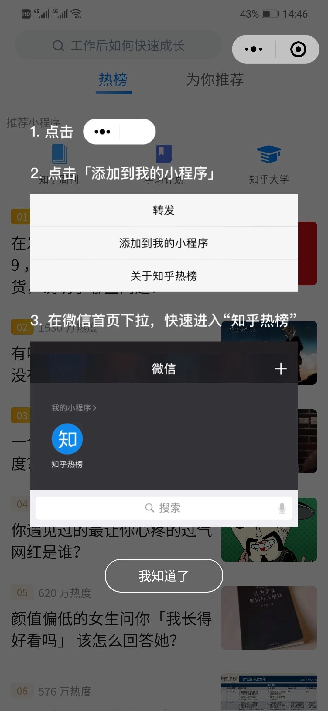 如果 知乎热搜在 最近使用 列表中弹图一 从其他场景值的话弹图二 我看官方api也没有判断在不在 最近使用列表的接口
