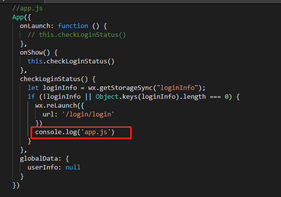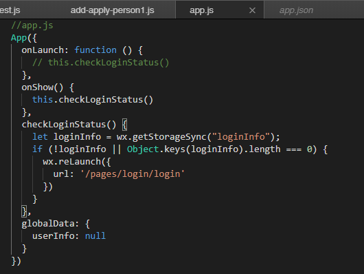 小程序默认进入首页,在app.js里有判断,本地是否存有登录信息,如果没有就跳转到登录页(全局只有此处有跳转登录页的逻辑) ↓↓↓