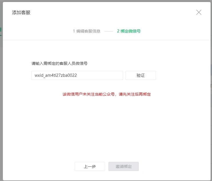 微信公众号后台添加客服,提示未关注本公众号,其实已经关注了。取消关注楚雄关注后,再绑定客服,还是不行