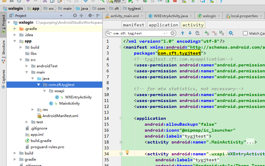 目录结构(报名下创建wxapi目录,目录下创建WXEntryActivity)