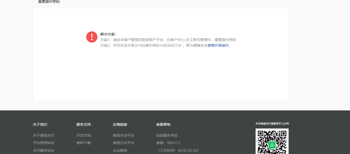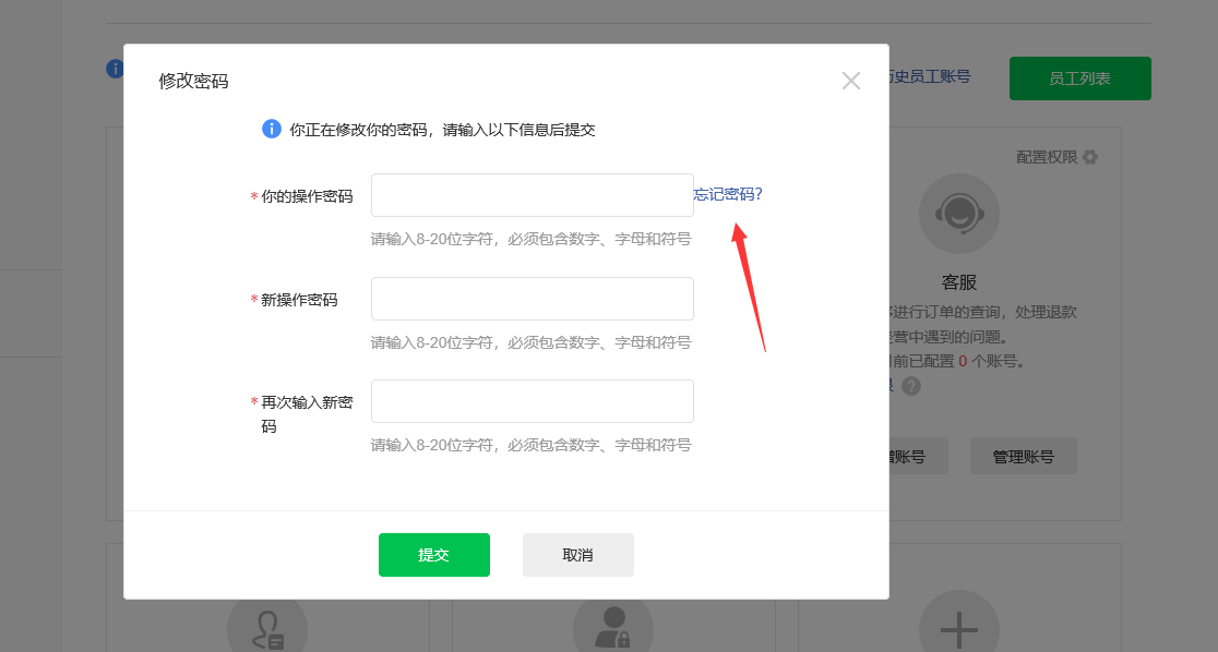 管理员忘记了操作密码 ,现在登陆后台点击忘记操作密码 出现1图要我去账户中心-员工账号管理-重置员工密码 这边页面点击员工列表图2就未见到重置修改操作密码相关,只有修改操作密码 这个修改密码是修改登陆密码 ,点击修改图3点击忘记密码又是回待图1