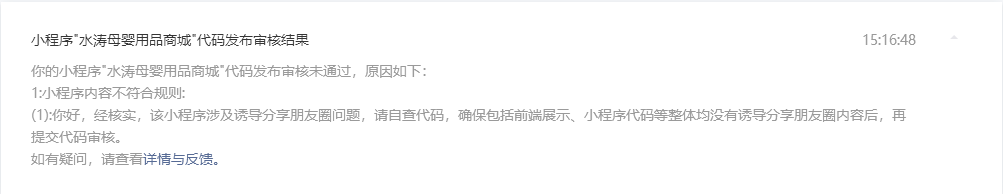 你好,经核实,你方小程序【我的专属码】-【保存相册,分享到朋友圈】涉及诱导分享朋友圈问题,请自查代码,确保包括前端展示、小程序代码等整体均不涉及诱导分享朋友圈内容后,再提交代码审核。