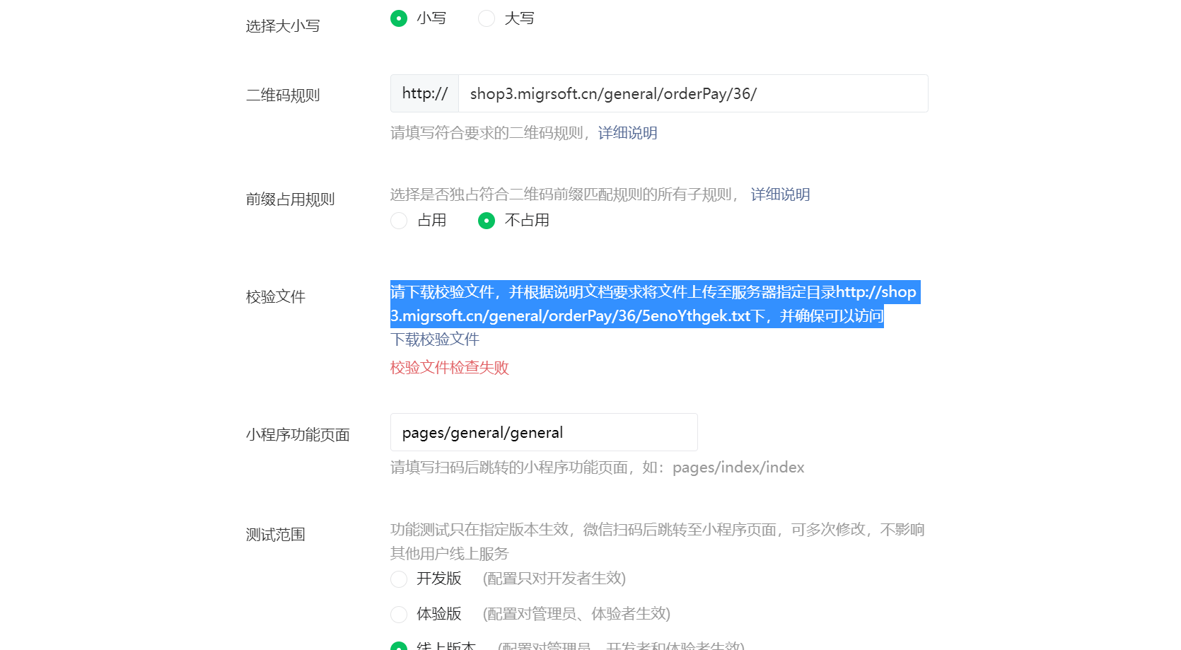 请下载校验文件,并根据说明文档要求将文件上传至服务器指定目录http://shop3.migrsoft.cn/general/orderPay/36/5enoYthgek.txt下,并确保可以访问