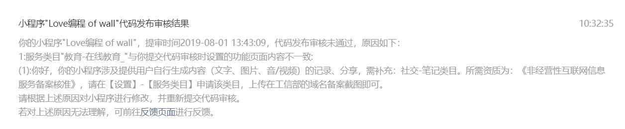 你好,经核实,贵方小程序代码确实涉及提供涉及提供用户自行生成内容(文字、图片、音/视频)的记录、分享,需补充:社交-笔记类目。或请自查代码,确保包括前端展示、小程序代码等整体均移除相关内容,再提交代码审核。(详图如下)
