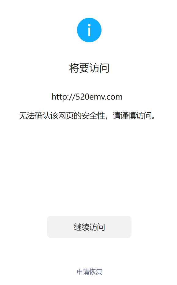 域名520emv.com于2024-01-17注册,于 2024-02-26备案通过,工信部 ICP 备案号:豫ICP备16016646号-140,用于建立中机商城有限公司官网,展示共享世界网站信息,经建站技术人员排查,不存在安全问题。但是在微信里打开网站链接,却提示'无法确认该网页的安全性,请谨慎访问’,现申请解除封禁。