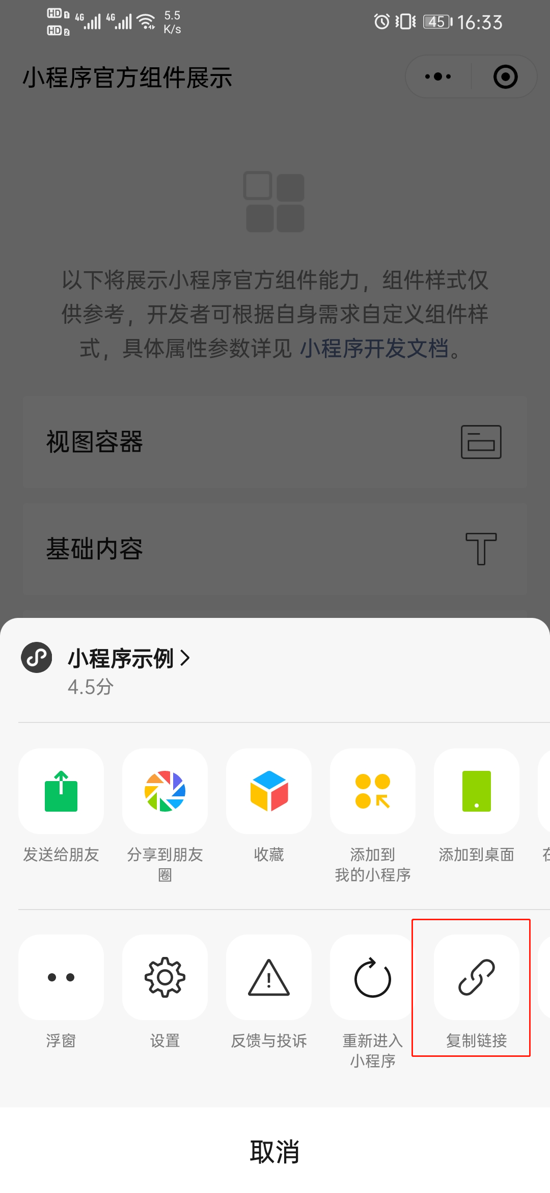 或者 自己手动去复制链接发送到聊天窗口打开 https://developers.weixin.qq.com/miniprogram/dev/api/share/wx.onCopyUrl.html