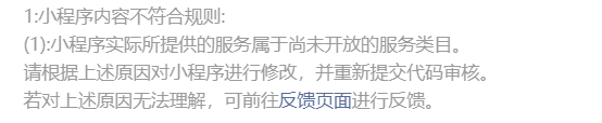 你好,经核实,你的小程序实际所提供的服务属于尚未开放的服务类目,请重新定位小程序功能