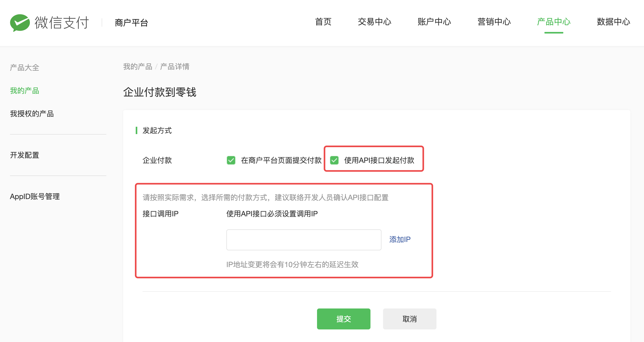 位置一:「微信支付商户后台」->「产品中心」->「企业付款到零钱」->「产品设置」->「付款发起方」->「接口调用IP」,确认使用API接口发起付款功能启用,并添加调用IP,或者扫码登录微信支付商户后台后「点我」直达