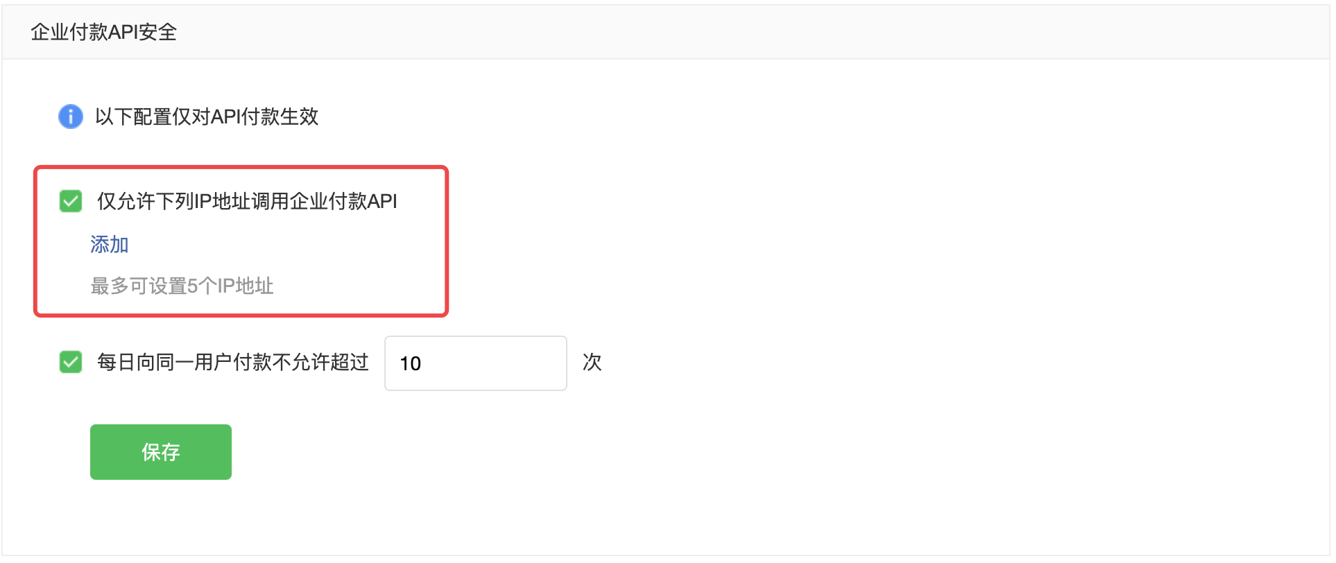 位置二:「微信支付商户后台-」>「账户中心」->「API安全」->「企业付款API安全」,或者扫码登录微信支付商户后台后「点我」直达,取消勾选「仅允许下列IP地址调用企业付款API」或在此添加调用IP