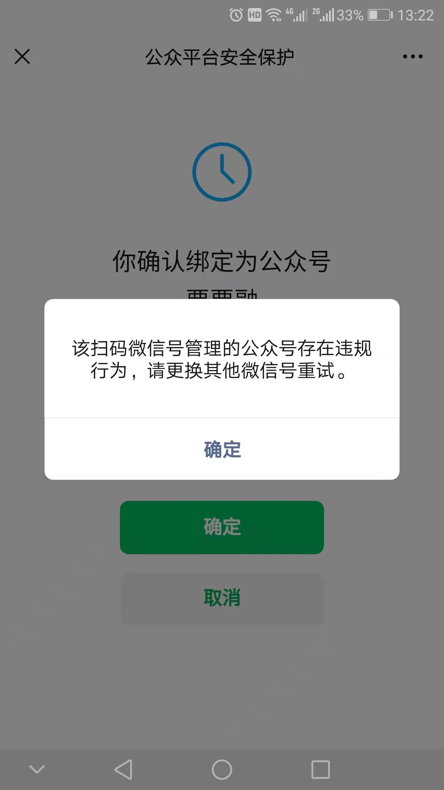 为什么无法绑定公众号,提示管理员管理公众号有违规,但查了所有的公众号,都没有违规?