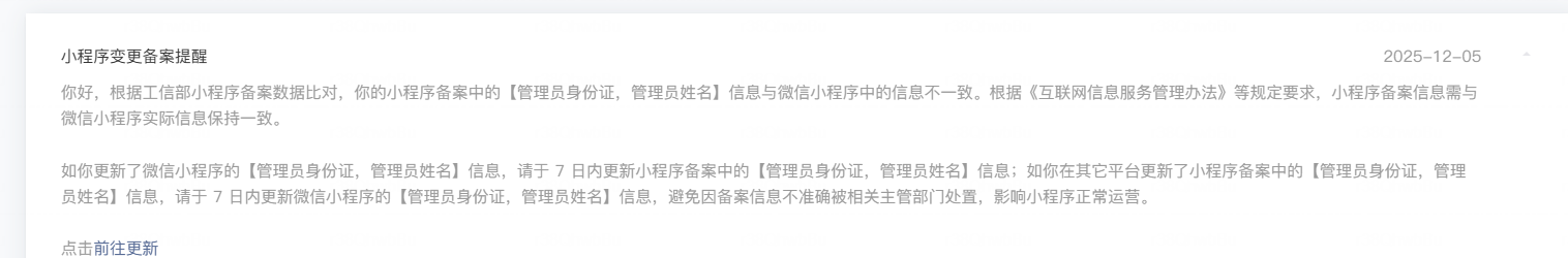 你好,请通过【小程序管理后台-设置-小程序备案-变更】发起变更备案,确保备案信息真实有效。