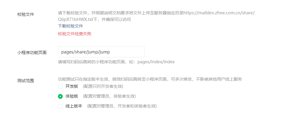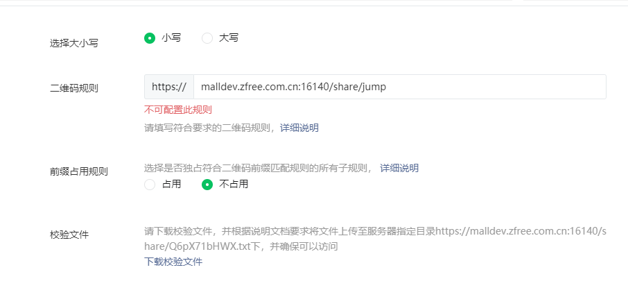 mall.zfree.com.cn/share/jump,选择的也是不占用子规则2、malldev.zfree.com.cn域名已完成ICP备案并通过微信平台验证3、所有可能需要验证的地址都下载了校验文件放到了对应的目录