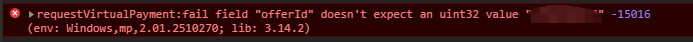 虚拟支付 :fail field "offerId" doesn't expect an uint32 value "123" -15016 。报错怎么解决的?