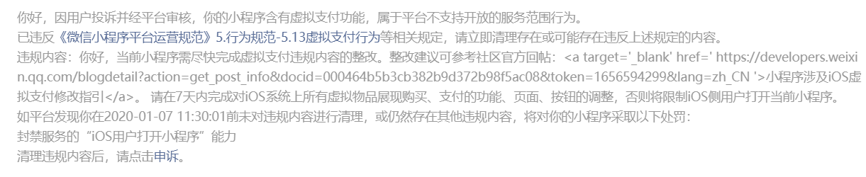 你好,微信官方工作人员,我司于2019年12月31号收到关于ios虚拟支付的问题,当时提交申诉的时候,以为写ios暂不支持购买,这个提示是没问题的,但是申诉没有通过,现已经把购买两字已经去掉并且修改为ios暂不支持,而且已经审核上线了,但是再次去申诉的时候,没有入口了,就审核不了。明天就是7号了,如果没有审核会禁封ios打开小程序,希望官方工作人员审查一下,appid是wxec3b2167a4ba23c3,谢谢,急急急。。