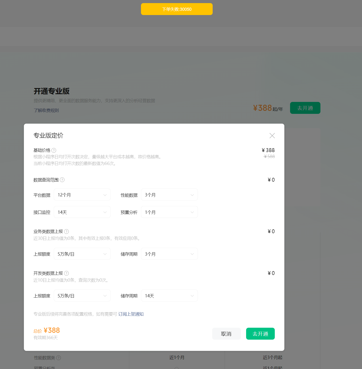 境外主体无法购买We分析,提示下单失败:30050,小程序已认证。