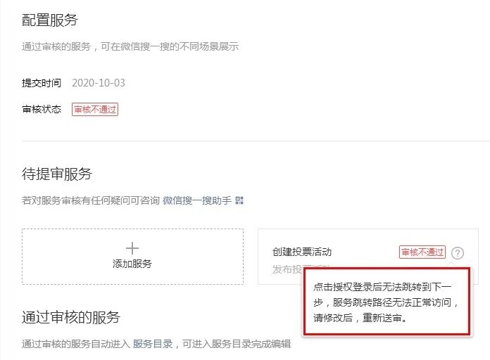 申请小程序服务搜索,接入服务页面申请多次审核不通过。提示“授权登录后无法跳转到下一步,服务跳转路径无法正常访问”。但是我们自己测试是可以实现授权及跳转到下一步。但是为什么微信审核人员每次都说授权后无法跳转到下一步?能否对审核不通过理由表达更加清楚一些?最好能够截图或是录屏反馈给我们?以便修改问题。