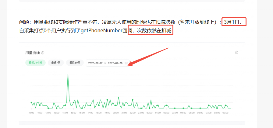 问题:用量曲线和实际操作严重不符,凌晨无人使用的时候也在扣减次数(暂未开放到线上);3月1日,自采集打点0个用户执行到了getPhoneNumber回调,次数依然在扣减