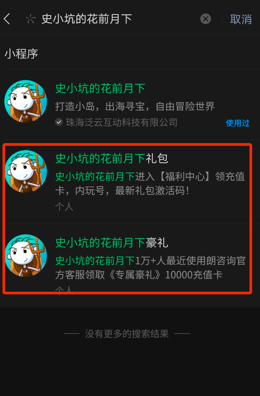 每当发布一个游戏,比如《AABBCC》,就会出现大量的《AABBCC礼包》《AABBCC福利》《AABBCC攻略》此类蹭流量的小程序。